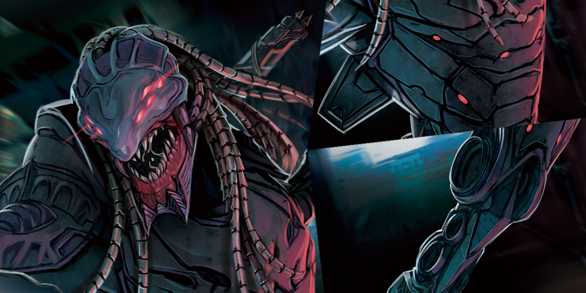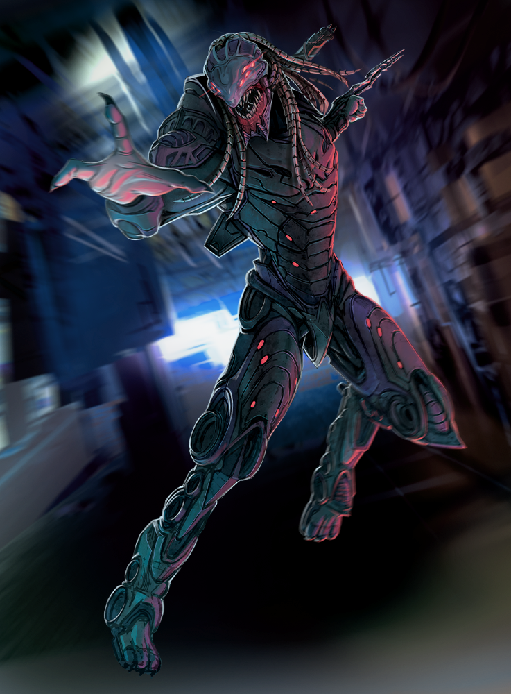 Its armor, forged from materials unique to its alien civilization, projects raw intimidation without slipping into lifeless mech plating. Organic textures and spiral motifs—hallmarks of its culture’s aesthetic— wind across the surface, making the design feel both alien and eerily alive.