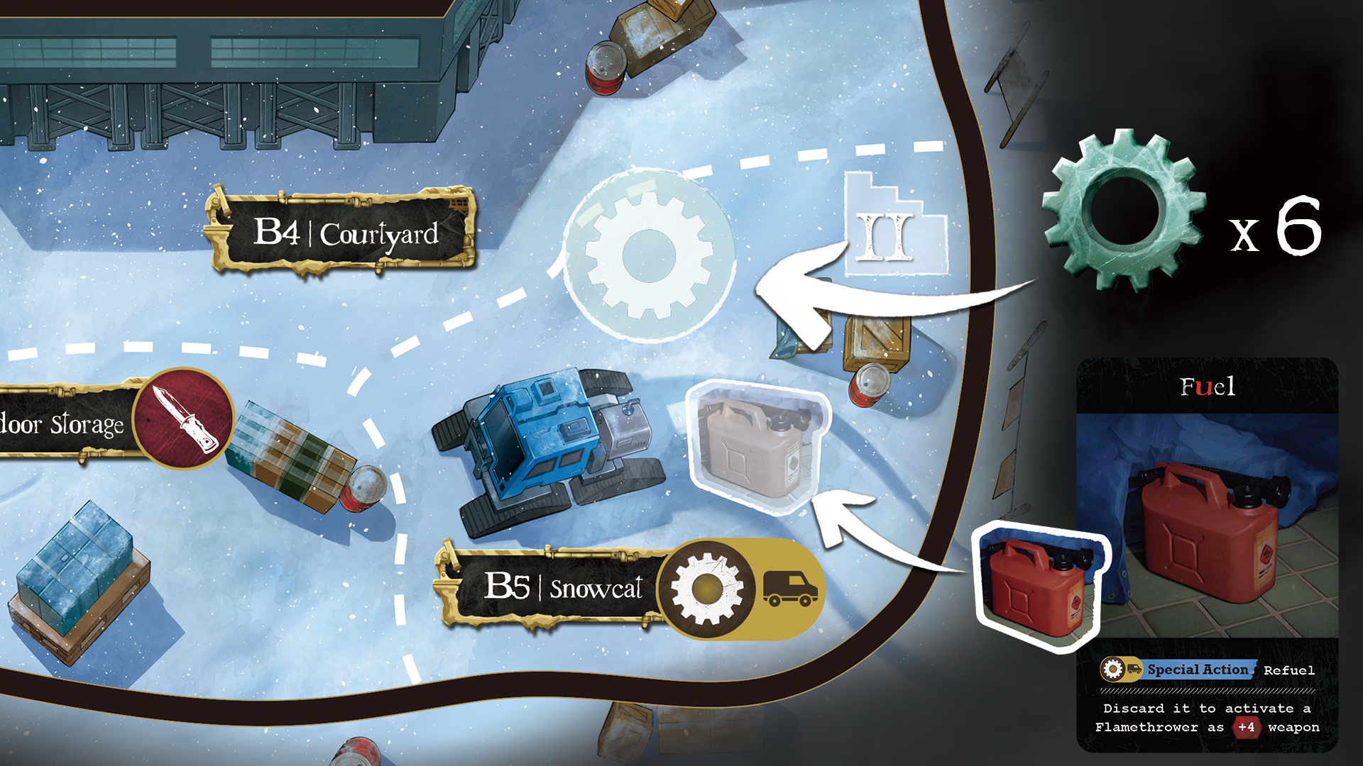 Repairing the Snowcat is just as risky as fixing the radio. Each repair action makes noise, which may expose your position to the Killer. And the Killer isn’t just standing by… If they are at the vehicle’s location, you won’t be able to repair it. But some item cards and Survivor abilities can rapid the repairing. So, teamwork is the key. Every turn counts. Every decision matters.