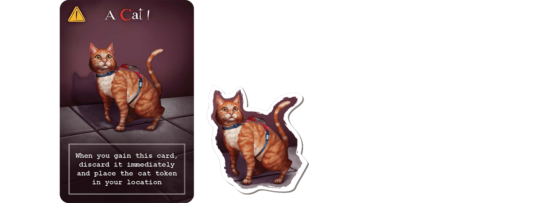 At the end of the Survivors’ turn, when drawing from the discover deck, if you reveal “A Cat!”, it meows immediately, making noise and giving away your location. Place the cat token in your room. From now on, each turn, anyone sharing a space with the cat may use an extra action to pet it. The cat will purr (make noise) and wander to an adjacent room of your choice. It’s like having a furry landmine that follows its own rules of chaos.