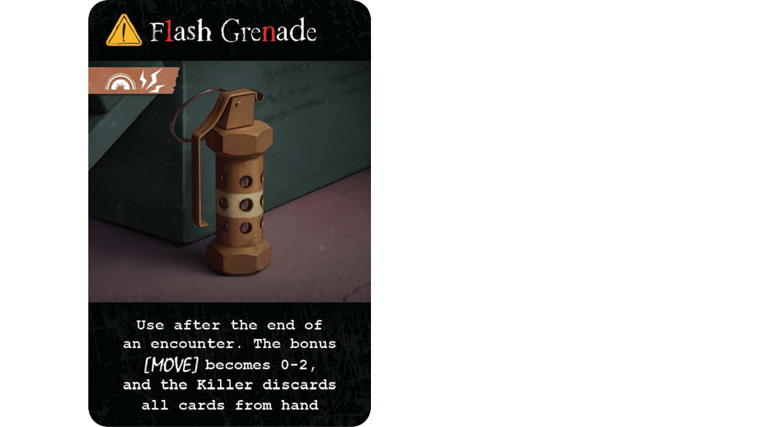 Used after an encounter, this grenade boosts an your escape potential. Normally, survivors can move 0–1 spaces after encounter. But with this item, it becomes 0–2, helping you vanish further into the shadows. As a bonus, the Killer discards all cards in hand, disrupting their plans and delaying their next big play.